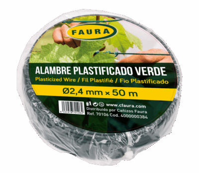 El Alambre Plastificado Verde está disponible en dos tamaños: Ø1,1 mm x 50 m y Ø2,4 mm x 50 m. Ideal para tensar alambradas, cercados y uso agrícola en viñedos o invernaderos, este alambre ofrece gran resistencia a la corrosión gracias a su recubrimiento plastificado. Su color verde se integra perfectamente en el entorno, proporcionando una solución estética y funcional para proyectos exteriores.