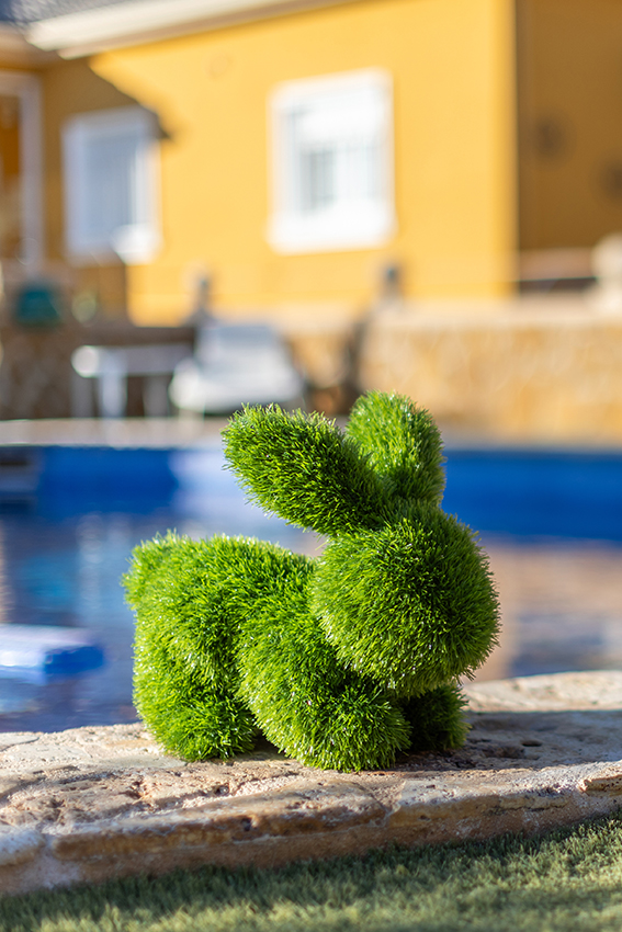 Este tipo de figuras están fabricadas a partir de fibras sintéticas de césped artificial que se cortan y moldean simulando la apariencia de animales y personajes. Pueden ser utilizadas en distintos espacios como jardines, eventos, decoraciones temáticas o en el diseño de áreas de juegos y paisajes urbanos, otorgando personalidad y originalidad donde lo sitúes.