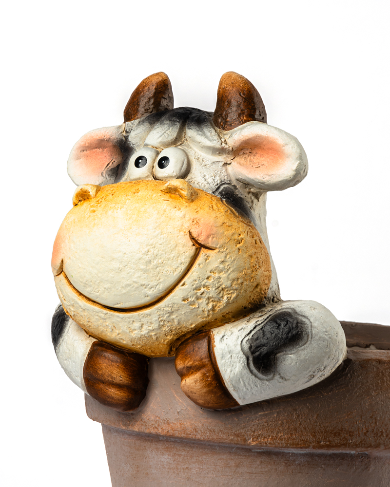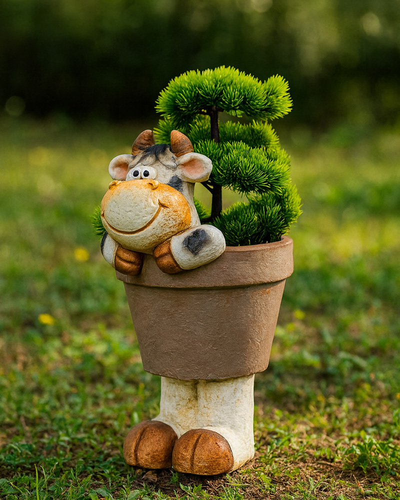 Dale un toque tierno y divertido a tus espacios con este encantador macetero de vaca, elaborado en poliresina de alta calidad. Su diseño muestra a una simpática vaquita asomándose desde dentro de una maceta rústica, con una expresión dulce y alegre que lo convierte en una pieza decorativa ideal para cualquier ambiente.